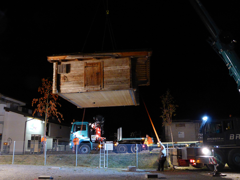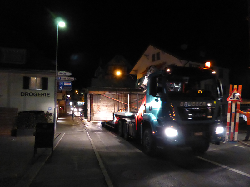 Am Abend des 23. Oktober 2018 wurde das schmucke Objekt auf einen Trailer geladen und anschliessend auf der Hauptstrasse durch das Dorf gefahren. Dazu musste die Strasse abschnittweise kurzzeitig gesperrt werden. Der Transport wurde auf beiden Seiten von Personen begleitet, die dem Fahrer den seitlichen Abstand per Funk übermittelten.