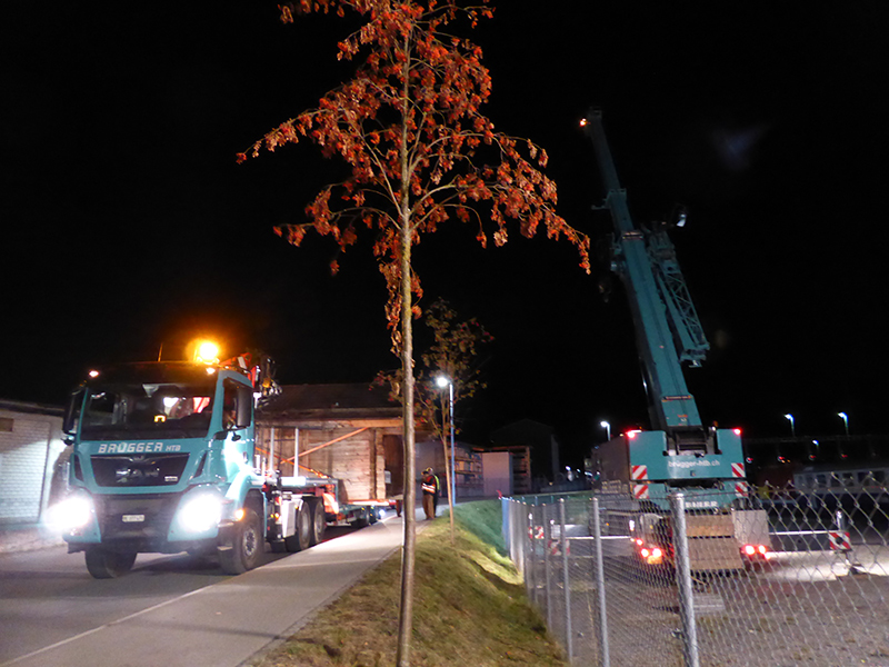 In der Parallelstrasse angekommen, wurde das Objekt mittels eigenem 60t Pneukran der Brügger HTB auf das Gelände der BLS gehoben und an seinen endgültigen Standort plaziert.