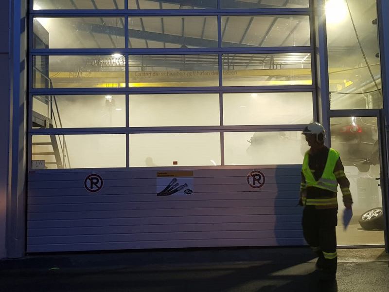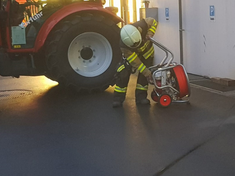 Schlussendlich wurde der untere Stock, wo sich der Brandherd befand mittels Überdrucklüfter gelüftet. Es konnte aber nicht verhindert werden, dass der Rauch in die obere Etage mit Werkstatt gedrückt wurde und dort mit einem zweiten Lüfter hinaus befördert werden musste.