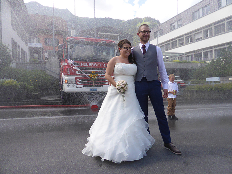 Anschliessend waren wir zum Apéro in der Sattelkammer hinter dem Restaurant zum Leist eingeladen. Herzlichen Dank!! Selbsteverständlich musste hier das Brautpaar noch einmal vor einem Wasservorhang posieren.
