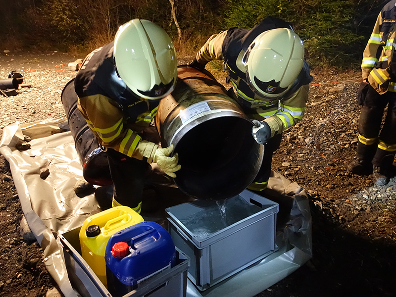 Diese Gebinde galt es als erstes zu bergen und in dichte Transportbehälter zu stellen. Die offenen Fässer mussten umgeschüttet werden, damit sie nicht weiteren Schaden anrichten.