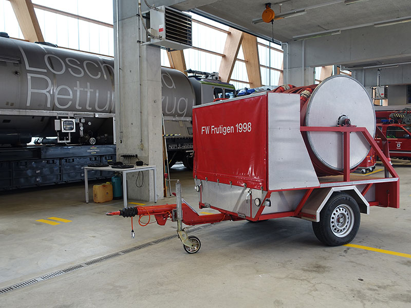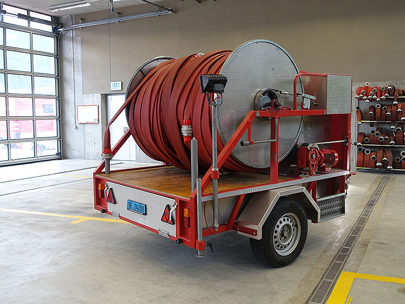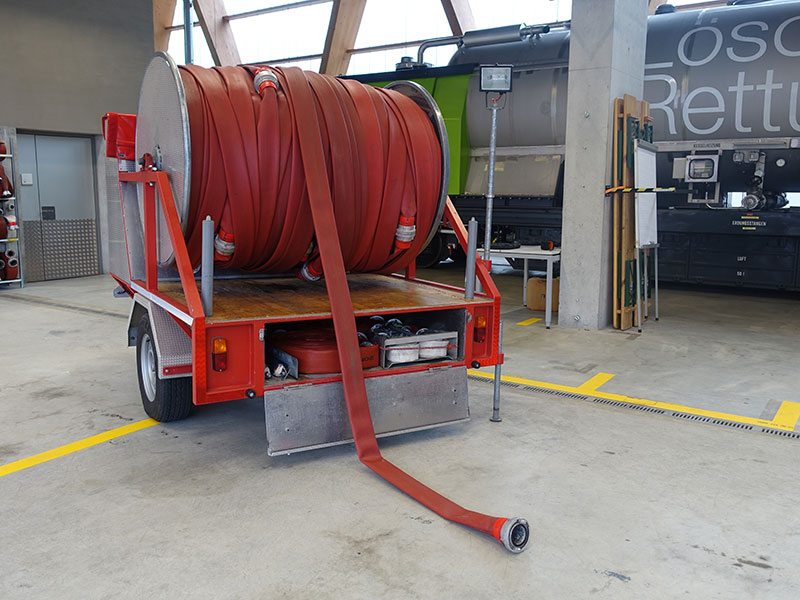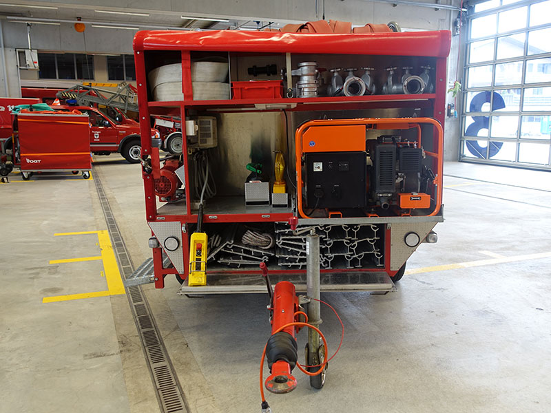 | Ausrüstung | 1200 m Transportschlauch 75er Notstromaggregat zur Beleuchtung des Arbeitsbereiches, Schlauchbrücken, Hyrantenanschlussset, Signalisationsmaterial |